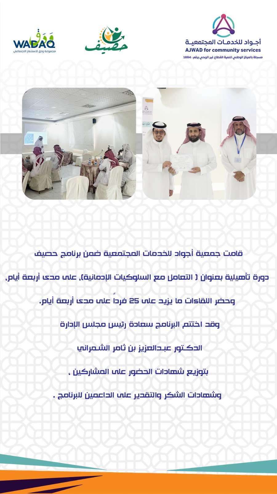 أقامت جمعية أجواد للخدمات المجتمعية ضمن برنامج حصيف دورة تأهيلية بعنوان ( التعامل مع السلوكيات الإدمانية)، على مدى أربعة أيام، وحضر اللقاءات ما يزيد على ٢٥ فرداً على مدى أربعة أيام.