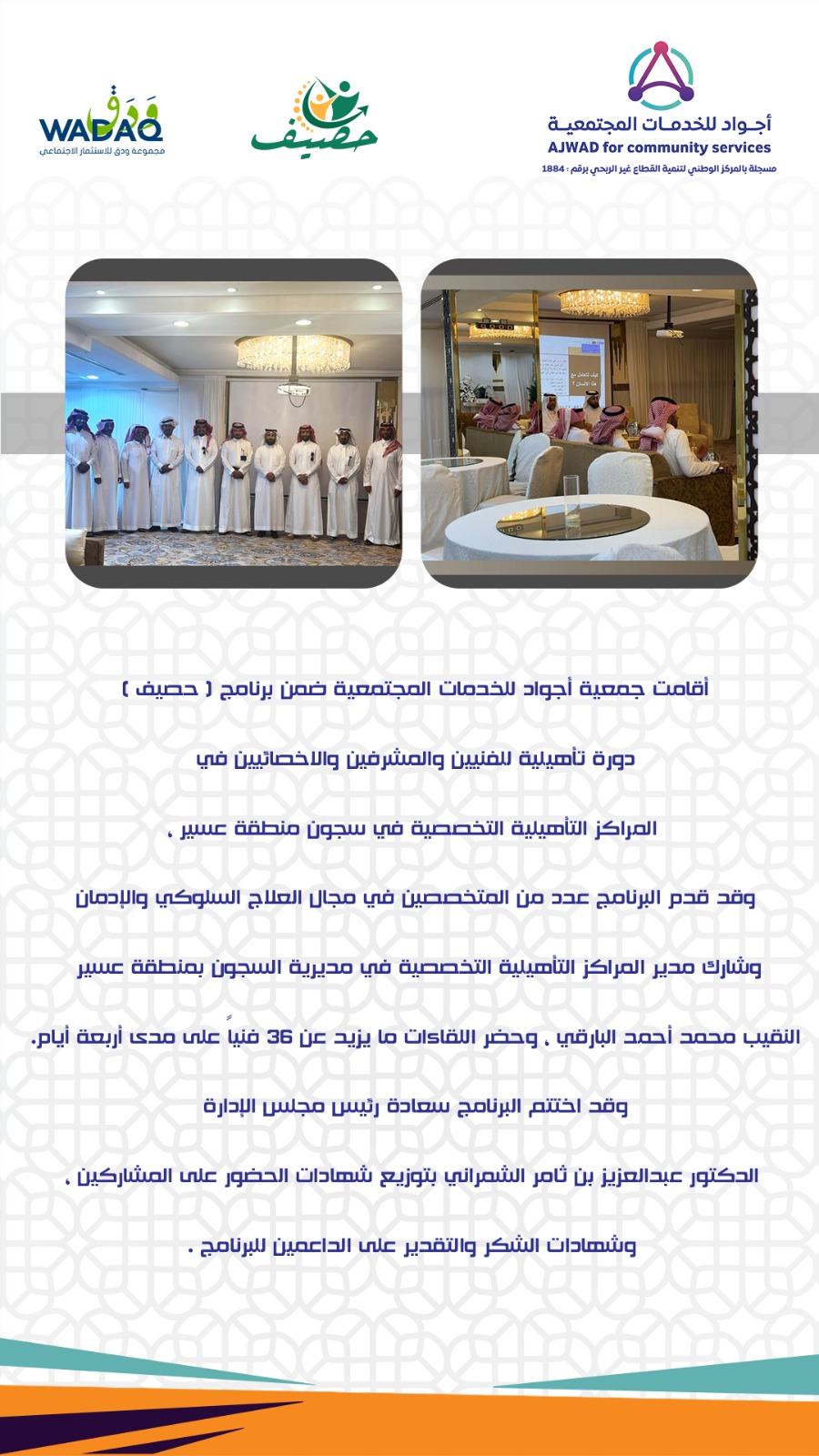 أقامت جمعية أجواد للخدمات المجتمعية ضمن برنامج ( حصيف ) دورة تأهيلية للفنيين والمشرفين والاخصائيين في المراكز التأهيلية التخصصية في سجون منطقة عسير ، وقد قدم البرنامج عدد من المتخصصين في مجال العلاج السلوكي والإدمان