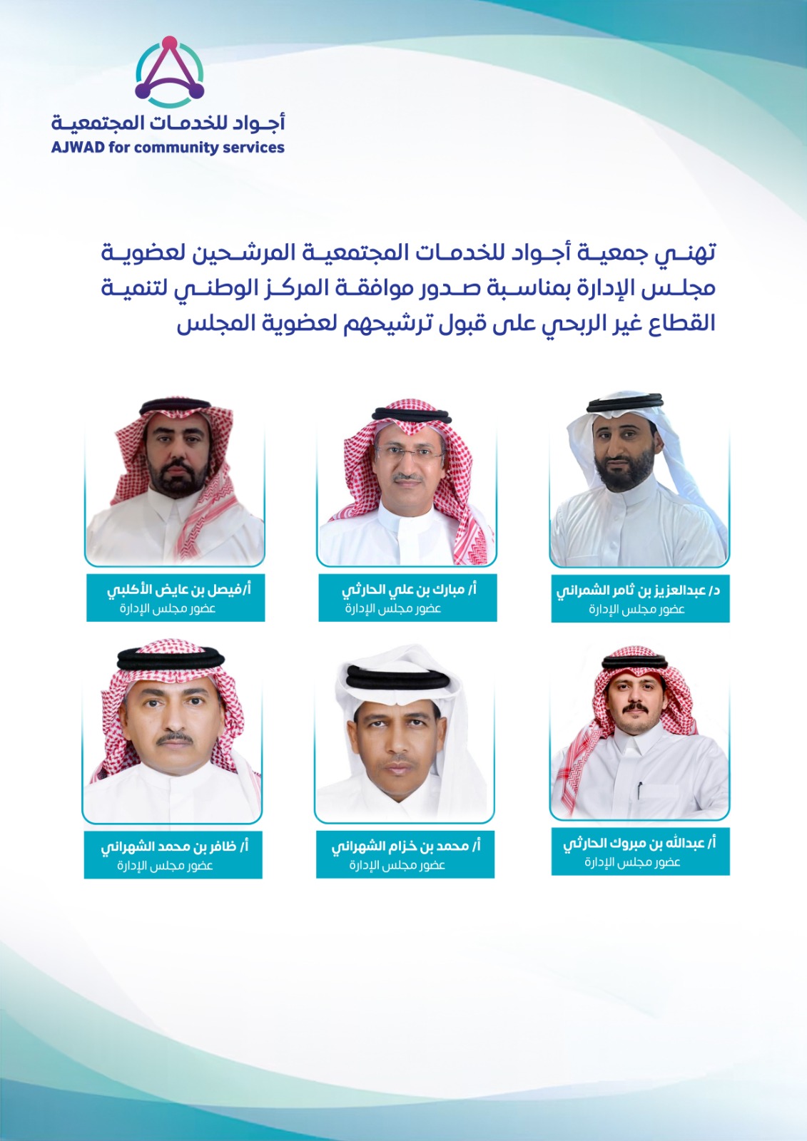 تهنئ جمعية أجواد للخدمات المجتمعية المرشحين لعضوية مجلس الادارة بمناسبة موافقة المركز الوطني لتنمية القطاع غير الربحي على قبول ترشيحهم لعضوية المجلس